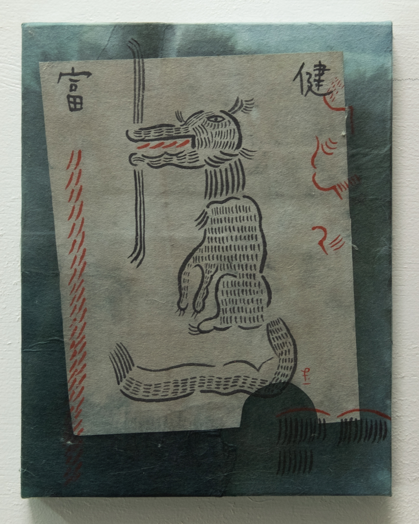富より健康オイノ / 木製パネル、手染め和紙、墨、アクリル絵の具 180mm×140mm 2023