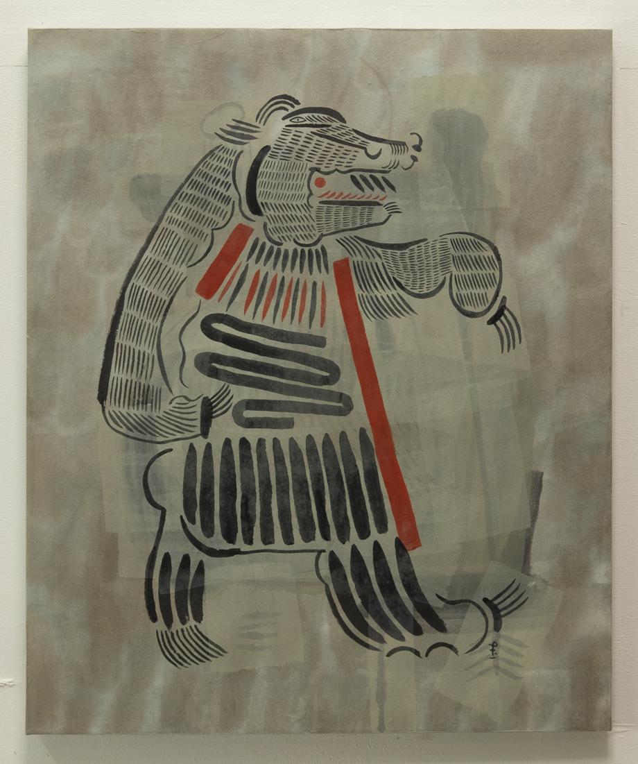 オオカミとヒグマとナイゾウ / 木製パネル、手染め和紙、墨、アクリル絵の具 500mm×606mm 2023