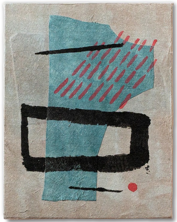 3クルと赤い点 / キャンバス、手染め和紙重ね貼り、墨、アクリル絵の具 180mm×140mm 2024
